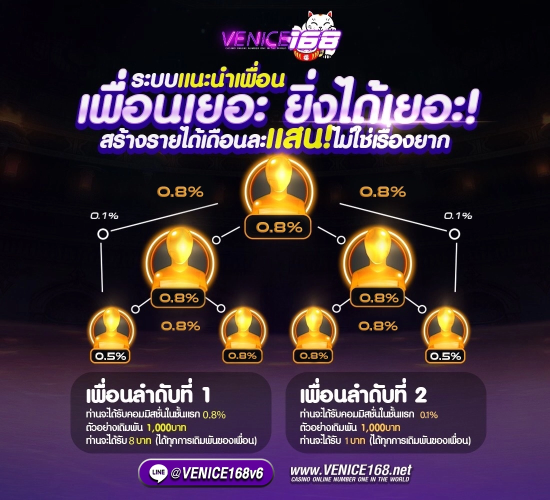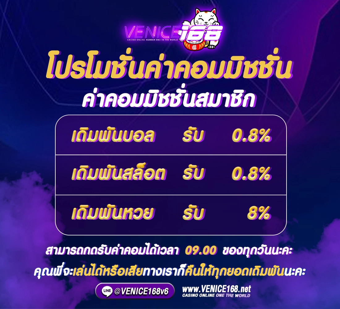 ที่ Venice168 เรายังมีโปรโมชั่นและกิจกรรมพิเศษมากมายตลอดทั้งปี ทั้งโบนัสต้อนรับสมาชิกใหม่ เครดิตฟรี และการคืนยอดเสีย เพื่อเพิ่มโอกาสในการทำกำไรให้กับผู้เล่น นอกจากนี้ยังมีระบบสะสมแต้มที่มอบสิทธิประโยชน์พิเศษมากมายสำหรับสมาชิก VIP อีกด้วย